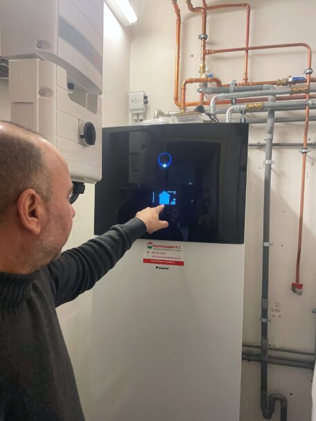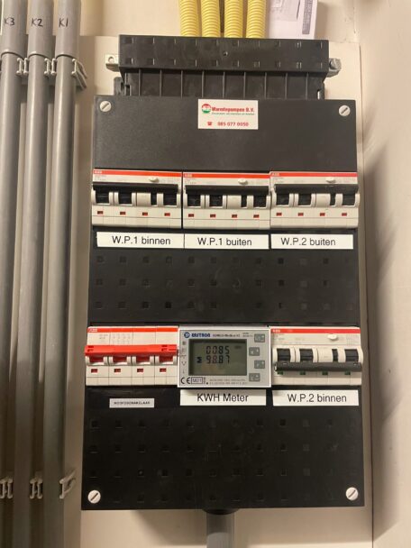 Kacem neemt ons mee naar de ruimte met de warmtepompen. ‘We hebben twee warmtepompen. Stel eentje kan het niet aan, dan schiet de andere warmtepomp buiten aan. Een cascaderegeling heet dat. In deze ruimte wordt ook de energie van de zonnepanelen omgevormd. De warmtepompen hebben allemaal een eigen meterkast. Je ziet hier ook de levering van de zonnepanelen. Je ziet hem nu bijvoorbeeld omhooglopen. Straks om 13.00 uur is het nog hoger. Het is echt mooi om te zien! En ik houd de deur ook op slot, want die omvormer is een gevraagd item op het moment. Nee hoor, dat is een grap. Ze zullen geen omvormer komen stelen.’ zegt Kacem.